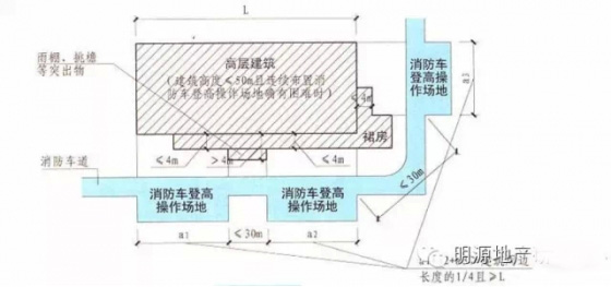 1)高層建筑應(yīng)至少沿一個(gè)長(zhǎng)邊或周邊長(zhǎng)度的l/4且不小于一個(gè)長(zhǎng)邊長(zhǎng)度的底邊連續(xù)布置消防車(chē)登高操作場(chǎng)地,該范圍內(nèi)的裙房進(jìn)深不應(yīng)大于4米;