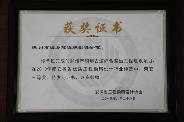安徽省工程勘察設(shè)計協(xié)會于2013年8月3日組織專家召開安徽省優(yōu)秀工程勘察設(shè)計行業(yè)獎評審會,對全省共62家單位上報的320個項目進行了為期兩天的評選。由我院市完成的滁州市瑯琊古道綜合整治工程建設(shè)項目在2013年度安徽省優(yōu)秀勘察設(shè)計行業(yè)評選中,榮獲三等獎。